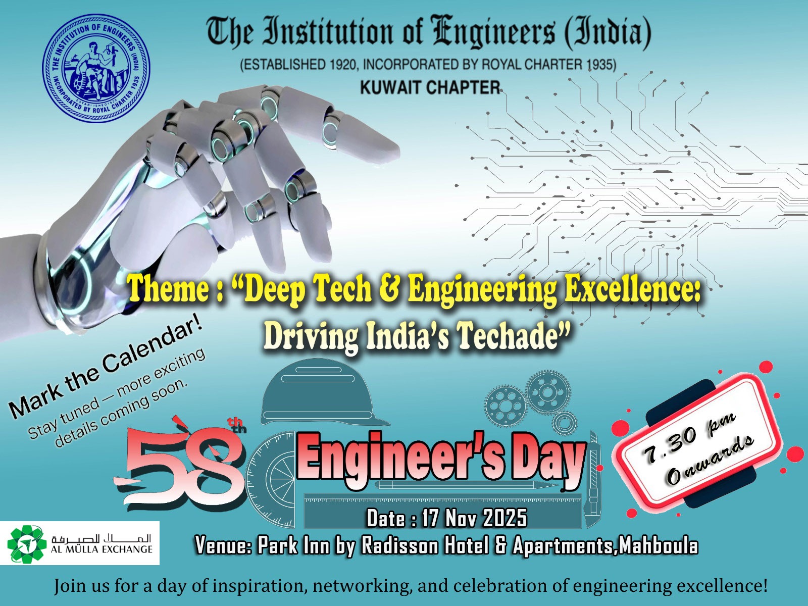 The IEI Kuwait Chapter will be celebrating the "58th Engineer's Day" on 17th Nov 2025 at the Park INN, Mahaboula,
